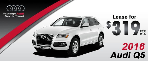*2016 Q5 2.0T Stk#GA025788 MSRP$41,870. Must qualify for Audi Rebate(s), current owner/lessee of a MY01 or newer Audi /listed competitive make/or lease inceptions will require an addtl cap reduction equal to rebate(s). Executive 24mos leases require a down payment of 10% of listed MSRP plus 1st pmt (if app), tax, transfer tag & fees ($2007), and above rebate(s). Sweet Spot 30mos leases require a down payment of 5% of listed MSRP plus 1st pmt (if app), tax, transfer tag & fees ($2007), and above rebate(s). Inceptions only 36mos leases require 1st pmt (if app), tax, transfer tag & fees ($2007), and above rebate(s). All offers require A tier credit approval, Non A-tier may be available at a higher monthly pmt. All leases are 7,500 miles; per year, $0.25 (A8 $0.35) charges per mi over. Lessee is responsible for insurance and an extra charge may be imposed at the end of the lease. Photos are for illustration only and may not be the exact model/trim of advertised vehicle. Prestige is not responsible for typographical errors. All offers are good thru date of publication.